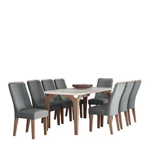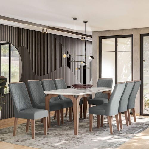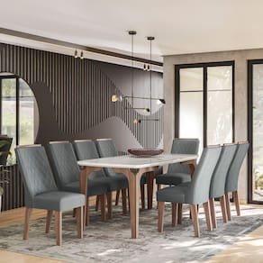 O conjunto Rubi Gold destaca-se pela impressão dos detalhes amadeirados, replicando um design clean e despojado. O tampo em vidro da um toque de modernidade ao ambiente, deixando o espaço das refeições ainda mais charmoso. Os acabamentos oferecem maior qualidade e durabilidade ao móvel. Medida da Mesa (A x L x P): 80,5 x 90 x 183 Peso da Mesa: 47 kg Mesa suporta até: 120 Acabamento da Cadeira/Banco: Pintura Texturizada Acabamento da Mesa: Pintura Texturizada Almofada do assento: Fixa Altura do Conjunto: 102 Ambiente Principal: Sala de Jantar Cadeira/Banco estofada: Encosto e Assento Estofados Cadeira/Banco suporta até: 120 Complexidade da Montagem: Média: pode ser montado por mais de uma pessoa e/ou necessite de maior conhecimento para montagem Cor: Amendoa/03A Cor da Base: Marrom Cor do Produto: Amêndoa/03A Cor do Tampo: Branco Cor Flex: Não Cor Secundária: Marrom De Canto (Canto Alemão): Não Design da Base: 4 Pés Enchimento do Assento: Espuma D-20 Enchimento do Encosto: Espuma D-20 Escala de Brilho: Fosco Espessura do Tampo: 37 Espessura do Vidro: mm Estrutura do Assento: MDF/ESPUMA Estrutura do Encosto: MDF Formato do Tampo: Retangular Itens Inclusos: 1 Mesa, 8 Cadeiras, Kit Ferragem, Manual de Montagem Linha ou Coleção: Rubi Gold Manual de Montagem e Instalação: https://cdn2.madeiramadeira.com.br/atributo/celta-moveis/1357517-manual-conjunto-rubi-gold.pdf Material da Base da Mesa: MDF Material da Estrutura da Cadeira: MDF Material do Tampo: Vidro/MDF Medida da Cadeira/Banco (A x L x P): 102 x 44,5 x 49 Medida do Tampo (L x C x E): 90 x 183 x 3,7 Mesa Extensível: Não Montagem Flex: Não Necessita Montagem: Sim Origem do Produto: Nacional Peso da Cadeira/Banco: 9 kg Possui Apoio para Braços: Não Possui Apoio Para os Pés: Não Possui Suporte Giratório: Não Quantidade de Lugares: 08 Recomendações de Uso, Manutenção e Limpeza: Limpeza com pano umedecido. Revestimento da Cadeira/Banco: Veludo Sistema de Montagem: Parafusos Vidro Temperado: Sim