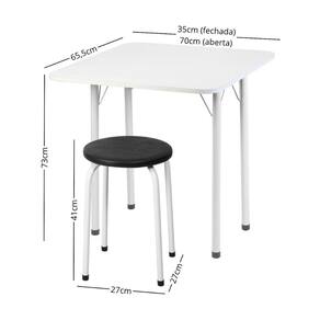 Dimensões do Produto Montado: Mesa: Altura: 73cm | Largura: 65,5cm | Profundidade: 35cm (fechada) - 70cm (aberta) Banqueta: Altura: 41cm | Largura: 27cm | Profundidade: 27cm *Você pode consultar as medidas detalhadas na imagem técnica do produto.