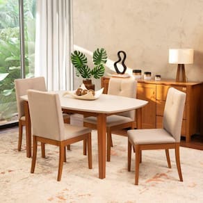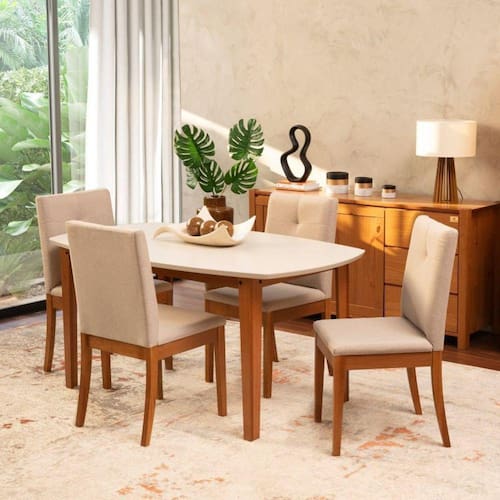 Acompanha 4 cadeiras de jantar Tiê, possuem estrutura em madeira maciça de reflorestamento, assento e encosto estofados. Suas formas são puras, o encosto recortado proporciona uma leveza ao produto, tornando uma peça ideal para todos os estilos de salas de jantar. Altura do Conjunto: 92.5 cm Ambiente: null Ambiente Principal: Sala de Jantar codigo_ean: 7909903069363 Cor: Bege/Amêndoa/Off White Cor do Produto: Bege/Amêndoa/Off White Informação Complementar: 1x Mesa Extensível Oval 2,0m Aberta Tiê Cabecasa MadeiraMadeira Amêndoa/Off White Largura: 90 cm Largura: 90 cm Altura: 75 cm Altura: 75 cm Peso: 38 kg Peso: 38 kg Profundidade: 160 cm Profundidade: 160 cm Necessita Montagem: Sim Necessita Montagem: Sim