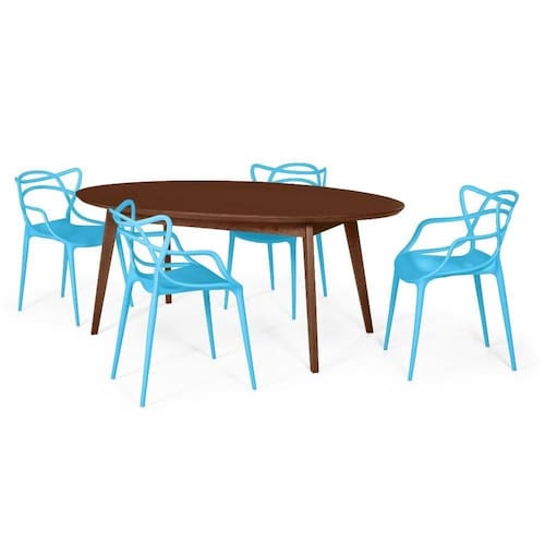 O conjunto também se destaca pelo seu design rústico, a Mesa Oval Vértice possui detalhes naturais da madeira maciça na cor nozes, a qual dá um aspecto mais aconchegante e natural ao seu ambiente. As Cadeiras Allegra com suas cores vivas é um item de decoração versátil e inovador, possui diversas linhas que se conectam para formar um design diferenciado e alegre no ambiente. Também se destaca no conforto proporcionado, pois suas curvas se encaixam perfeitamente ao nosso corpo, tornando-se muito aconchegante!