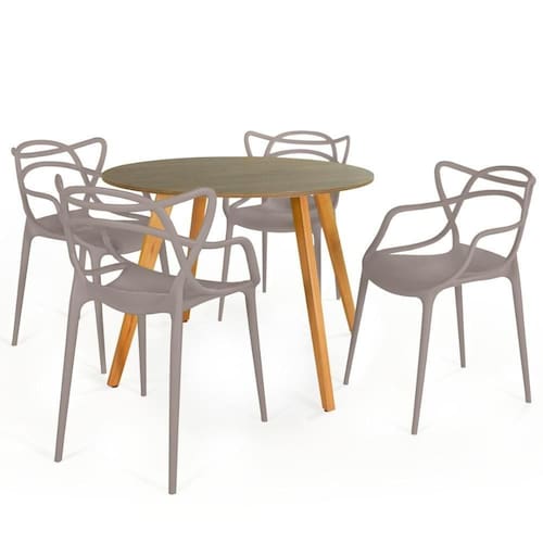 A mesa redonda Laura com em mdf e pés amadeirados combina perfeitamente com as icônicas cadeiras Allegra, conhecidas por seu design inovador e conforto. O conjunto se adapta facilmente a diferentes estilos de decoração, desde o moderno até o contemporâneo.