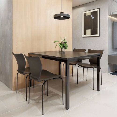 Qual é o benefício de uma cadeira com tratamento anti-Uva? O tratamento protege contra os raios solares que causam o debotamento. Medida da Mesa (A x L x P): 75x120x85 Peso da Mesa: 20,5 kg Mesa suporta até: 40 kg Acabamento da Cadeira/Banco: Pintura Acabamento da Mesa: Pintura UV Ambiente Principal: Sala de Jantar Cadeira/Banco estofada: Não Cadeira/Banco Estofada: Não Cadeira/Banco suporta até: 120 kg codigo_ean: 7900288185402 Complexidade da Montagem: Média: pode ser montado por mais de uma pessoa e/ou necessite de maior conhecimento para montagem Cor: Preto Cor da Base: Preto Cor das Cadeiras: Preto Cor do Produto: Preto Cor Secundária: Cinza De Canto (Canto Alemão): Não Escala de Brilho: Semi-Brilho Espessura do Tampo: 28 mm Estrutura do Assento: Polipropileno Formato do Tampo: Retangular Itens Inclusos: 1 Mesa, 4 Cadeiras, Kit Ferragens e Manual de Montagem Linha ou Coleção: Mono Manual de Montagem e Instalação: https://product-hub-prd.madeiramadeira.com.br/400808985/documents/0bca737f-f8c9-4fe0-8382-98c78f27a4eb303596073217513778067229.pdf Marca: Prima Design Material da Base da Mesa: Aço Carbono Material da Estrutura da Cadeira: Aço Carbono Material do Tampo: Madeira Maciça Medida da Cadeira/Banco (A x L x P): 81x47x53 Medida do Tampo (L x C x E): 120x85x28 Mesa Extensível: Não Necessita Montagem: Sim Origem do Produto: Nacional Peso da Cadeira/Banco: 3,6 kg Possui Apoio Para os Pés: Não Quantidade de Cadeiras: 4 Quantidade de Lugares: 04 Recomendações de Uso, Manutenção e Limpeza: A estrutura deve ser limpa utilizando pano seco de algodão ou flanela. Se necessário, utilize pano umedecido apenas com água, secando o móvel em seguida. Não utilize solvente, álcool, acetona, lustra móveis, produtos abrasivos e outros produtos que contenham soda e ou ácidos para limpar e tirar manchas dos móveis. Não expor os móveis à luz solar e ambientes com umidade relativa elevada. Manter a estrutura metálica limpa, utilizando pano seco ou cera a base de silicone. Sistema de Montagem: Parafusos Tipo de Madeira Maciça do Tampo: Pinus Marca: Não Informado