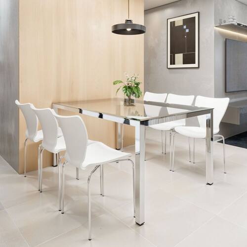 Descubra o conjunto perfeito: mesa retangular com tampo de vidro e 6 cadeiras de polipropileno com base de aço resistente! Com tratamento anti UVA, suas cores permanecem vibrantes mesmo sob sol intenso, evitando desbotamento. Elegante, perfeita para sala de jantar, mas também conquista bares e hamburguerias, adapta-se onde sua criatividade mandar. A união entre durabilidade do aço e praticidade e leveza do polipropileno cria o equilíbrio ideal para uso interno e externo. Resistente, elegante e surpreendentemente funcional, o conjunto que acompanha seu estilo de vida!
