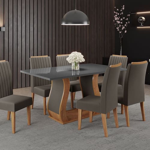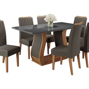 O conjunto acompanha 6 cadeiras modelo Fran, que se destacam pelo conforto proporcionado pelo assento D26, ideal para longos momentos à mesa. O design das cadeiras é contemporâneo e elegante, combinando perfeitamente com a mesa, criando um ambiente harmônico e acolhedor. Este conjunto é ideal para quem deseja praticidade sem abrir mão da beleza, sendo a opção perfeita para jantares em família ou recepções com amigos Medida da Mesa (A x L x P): A:79,4 X L:160 x P:80cm Peso da Mesa: 57,9 kg Mesa suporta até: 50.0000 Acabamento da Cadeira/Banco: Pintura UV Acabamento da Mesa: Pintura UV Acompanha Manual de Instalação: Sim Ambiente Principal: Sala de Jantar Cadeira/Banco estofada: Encosto e Assento Estofados Cadeira/Banco Estofada: Encosto e Assento Estofados Cadeira/Banco suporta até: 90.0000 codigo_ean: 7900288048288 Complexidade da Montagem: Média: pode ser montado por mais de uma pessoa e/ou necessite de maior conhecimento para montagem Configuração do Conjunto: Mesa com Cadeiras Cor: Mel/Grafite Cor do Produto: Mel/Grafite Cor Secundária: Cinza De Canto (Canto Alemão): Não Enchimento do Assento: Espuma D-26 Enchimento do Encosto: Espuma D-20 Escala de Brilho: Semi-Brilho Espessura do Tampo: 25 mm Estrutura do Assento: MDP/Espuma Estrutura do Encosto: MDP Formato do Tampo: Retangular Informações Complementares: Sala de Jantar 6 lugares Itens Inclusos: 1 mesa, 6 cadeiras, 1 kit ferragem, 1 manual de montagem Largura do Conjunto: 160 cm Manual de Montagem e Instalação: https://product-hub-prd.madeiramadeira.com.br/974919/documents/3674f354-f4eb-4786-a25b-370835844ad1263721552817371401292887.pdf Marca: Viero Material da Base da Mesa: MDF/MDP Material da Estrutura da Cadeira: MDF/MDP Material do Tampo: Vidro/MDP Material Principal das Cadeiras/Bancos: MDF/MDP Medida da Cadeira/Banco (A x L x P): A: 101 x L:42 x P:58,5cm Medida do Tampo (L x C x E): L:160 x C:80 x P:58,5cm Mesa Extensível: Não Necessita Montagem: Sim Origem do Produto: Nacional Peso da Cadeira/Banco: 8 kg Possui Apoio para Braços: Não Possui Apoio Para os Pés: Não Possui Vidro: Sim Profundidade do Conjunto: 80 cm Quantidade de Cadeiras: 6 Quantidade de Lugares: 06 Recomendações de Uso, Manutenção e Limpeza: limpar com pano levemente umedecido Revestimento da Cadeira/Banco: Veludo Sistema de Montagem: Parafusos,cavilhas Tipo de Encosto: Estofado