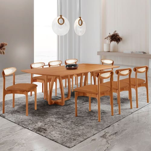Para completar o conjunto, a Cadeira Mônaco Premium oferece conforto e sofisticação. Seu encosto foi projetado para proporcionar melhor ergonomia, enquanto o assento estofado garante mais comodidade durante as refeições e encontros com família e amigos. O acabamento cuidadoso e os materiais de qualidade reforçam o estilo elegante do conjunto. Medida da Mesa (A x L x P): 240x110x80cm Peso da Mesa: 87,4 kg Mesa suporta até: 40 kg Acabamento da Cadeira/Banco: Pintura UV Acabamento da Mesa: Pintura UV Almofada do assento: Fixa Ambiente Principal: Sala de Jantar Cadeira/Banco Estofada: Somente Assento Estofado Cadeira/Banco estofada: Somente Assento Estofado Cadeira/Banco suporta até: 140 kg Cadeira/Banco Suporta Até: 140.0000 codigo_ean: 7900288352309 Complexidade da Montagem: Média: pode ser montado por mais de uma pessoa e/ou necessite de maior conhecimento para montagem Configuração do Conjunto: Mesa com Cadeiras Cor: Cinamomo/Caramelo Cor da Base: Natural Cor das Cadeiras: Marrom Cor do Produto: Cinamomo/Caramelo Cor do Tampo: Natural Cor Flex: Não Cor Secundária: Marrom De Canto (Canto Alemão): Não Escala de Brilho: Brilhante Espessura do Tampo: 40 mm Estrutura do Assento: Madeira Maciça Formato do Tampo: Retangular Informações Complementares: As cadeiras são entregues totalmente montadas e prontas para uso, enquanto a mesa chega pré-montada, facilitando a instalação e garantindo praticidade. Itens Inclusos: 1 Mesa, 8 Cadeiras e Kit Ferragens Linha ou Coleção: Ello/Mônaco Premium Manual de Montagem e Instalação: https://product-hub-prd.madeiramadeira.com.br/703969108/documents/b925bf56-72a7-49f0-83d2-58452ce49846343575658441773056258677.pdf Marca: Mobilare Material da Base da Mesa: MDF Laminado/Madeira Maciça Material da Estrutura da Cadeira: Madeira Maciça Material do Tampo: Laminado Material Principal: Madeira Maciça/MDF Material Principal das Cadeiras/Bancos: Madeira Maciça Medida da Cadeira/Banco (A x L x P): 86x48x53cm Medida do Tampo (L x C x E): 240x110x4cm Mesa Dobrável: Não Mesa Extensível: Não Montagem Flex: Não Necessita Montagem: Sim Origem do Produto: Nacional Peso da Cadeira/Banco: 5,7 kg Possui Apoio para Braços: Não Possui Apoio Para os Pés: Não Possui Prateleiras: Não Possui Vidro: Não Quantidade de Cadeiras: 8 Quantidade de Lugares: 08 Recomendações de Uso, Manutenção e Limpeza: Limpar com pano seco. Sistema de Montagem: Parafusos Tipo de Assento: Fixo Tipo de Encosto: Fixo