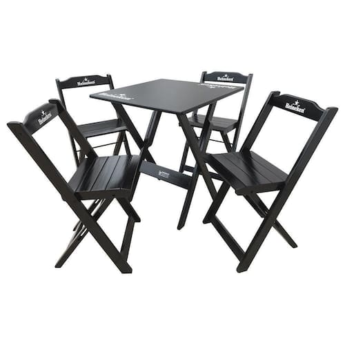 Conjunto Mesa Dobrável 60x60 Com 4 Cadeiras De Madeira Personalizada Hei Preta - TarimatãÉ ideal para bares, restaurantes, estabelecimentos, áreas de lazer e também para sua casa. Em madeira tornando-os resistentes e duráveis. Seu design permite que esse conjunto seja encaixado em qualquer ambiente, trazendo um toque a mais para seu estabelecimento. Além de sua durabilidade, o que lhe trará conforto para servir seus clientes. Por ser dobrável torna-se mais fácil guardar, manusear e limpar o produto.Tipo: Conjunto Mesa 4 Cadeiras de MadeiraModelo: DobrávelCor: PretoMedidas Mesa:Altura: 77cmLargura: 60cmComprimento: 60cmMedidas Cadeira:Altura: 78cmLargura: 41,5cmComprimento: 40cmAtenção: EVITE USAR PRODUTOS ABRASIVOS E QUÍMICOS PARA LIMPEZA DO PRODUTO, aconselha-se o uso de pano umedecido para melhor conservação; mantenha o produto fora de chuva e sol constantes.ATENÇÃOIMAGENS MERAMENTE ILUSTRATIVAS REALIZADO EDIÇÃO, PODENDO HAVER UMA PEQUENA VARIAÇÃO DE COR DEPENDENDO DE CADA TELA OU MONITOR.Conjunto Mesa DobrÃvel 60x60 com 4 Cadeiras de Madeira Personalizada Hei Preta