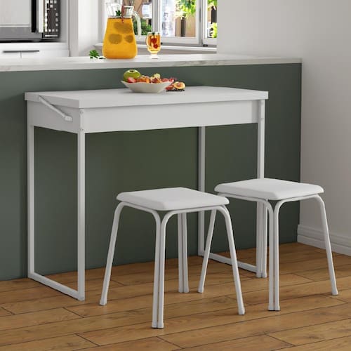 O Conjunto Sala de Jantar é composto por uma mesa dobrável e duas banquetas. Ideal para quem busca um produto funcional e que evite ocupar muito espaço. Sua mesa permite acomodar dois lugares quando fechada e até quatro quando aberta. As duas unidades da banqueta podem ser armazenadas embaixo da mesa ou armazenadas empilhadas, otimizando a área de circulaçãoe o armazenamento do ambiente.