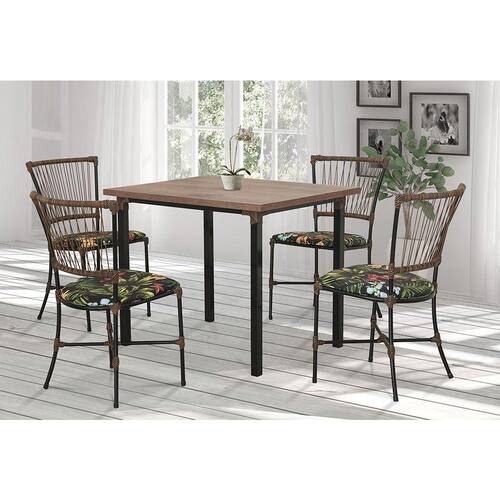 O Conjunto Gramado no fio é composto por 4 cadeiras, 1 base e 1 tampo em MDP, tramado na fibra sintética, produto de alta qualidade com proteção UV na fibra, produzida em estrutura de ferro e pintura eletrostática, assim garantindo sua durabilidade contra a ação do tempo, soldada na solda MIG, proporcionando maior resistência ao produto. O revestimento do encosto da cadeira é tramado na fibra sintética no fio, com o assento almofadado com espuma D-28 revestido com tecido floral impermeavel, assim trazendo mais conforto para seu uso no dia a dia. O Conjunto Gramado é um móvel que ira trazer um toque mais sofisticado para a sua cozinha, além do conforto é claro! Assim sera muito mais gostoso recepcionar amigos e familiares. Esse conjunto de mesa, pode ser utilizado tanto para cozinhas, sala de estar, restaurantes, cafeterias e bares.