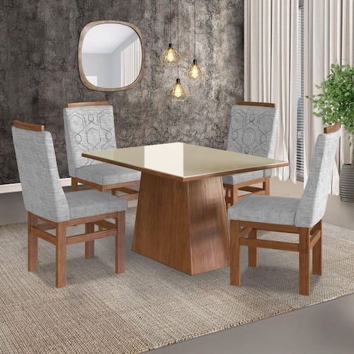 Mesas e Cadeiras são indispensáveis para o funcionamento da casa e é no cômodo de confraternização que elas ganham protagonismo. Composto por peças de muito charme, o conjunto de Mesa e Cadeiras ref:143/26 produzida em madeira maciça orna o uso desse móvel importante com mesas para 4 lugares para garantir uma usabilidade plena para o seu dia a dia. Ideal para cozinhas e salas de jantar, o kit oferece amplo espaço para que você possa dispor pratos, copos, talheres e até uma travessa com o quitute da vez, enquanto acomoda os convidados com aconchego e receptividade. Ah, para completar, é só combiná-la com o restante da mobília de sua preferência e criar o ambiente intimista perfeito para a sua rotina ou reuniões entre amigos. Medida da Mesa (A x L x P): 82x120x90 Peso da Mesa: 40 kg Mesa suporta até: 100 kg Acabamento da Cadeira/Banco: Pintura UV Acabamento da Mesa: Pintura UV Almofada do assento: Fixa Altura do Conjunto: 106 cm Ambiente Principal: Sala de Jantar Cadeira/Banco estofada: Encosto e Assento Estofados Cadeira/Banco suporta até: 120 kg Complexidade da Montagem: Média: pode ser montado por mais de uma pessoa e/ou necessite de maior conhecimento para montagem Cor: Canela/Off White Cor da Base: Marrom Cor do Produto: Canela/Off White Cor do Tampo: Bege Cor Flex: Canela/Linho Cinza Cor Secundária: Marrom De Canto (Canto Alemão): Não Design da Base: Trapézio Enchimento do Assento: Espuma D-23 Enchimento do Encosto: Espuma D-14 Escala de Brilho: Semi-Brilho Espessura do Tampo: 29 mm Espessura do Vidro: mm Estrutura do Assento: HDF Estrutura do Encosto: HDF Formato do Tampo: Retangular Informações Complementares: Mesa para sala de jantar com vidro lapidado off white, com 4 cadeiras de madeira maciça reflorestada Itens Inclusos: 1 Mesa, 4 cadeiras, kit ferragens e manual de montagem Linha ou Coleção: 2022 Manual de Especificação Técnica: https://cdn2.madeiramadeira.com.br/atributo/mOveis-zamarchi/1028049-manual-mesa-e-cadeira.pdf Manual de Montagem e Instalação: https://cdn2.madeiramadeira.com.br/atributo/mOveis-zamarchi/1028050-manual-mesa-e-cadeira.pdf Material da Base da Mesa: MDP Material da Estrutura da Cadeira: Madeira Maciça Material do Tampo: Vidro/MDP Medida da Base (A x L x P): 75x67x41 Medida da Cadeira/Banco (A x L x P): 106x45x49 Medida do Tampo (L x C x E): 120x90x2,9cm Mesa Extensível: Não Montagem Flex: Apenas Opção do Manual Necessita Montagem: Sim Origem do Produto: Nacional Peso da Cadeira/Banco: 9 kg Possui Apoio para Braços: Não Possui Apoio Para os Pés: Sim Possui Suporte Giratório: Não Quantidade de Lugares: 04 Recomendações de Uso, Manutenção e Limpeza: Limpeza com pano macio e levemente umedecido Revestimento da Cadeira/Banco: Linho Sistema de Montagem: Parafusos, cantoneiras, tapa furo, cola