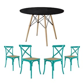Conjunto De Mesa Eiffel Redondo Tampo De Madeira 110cm Preto Com 4 Cadeiras Katrina em Aço Azul Turquesa Assento BegeA sua cozinha ou sala de jantar ficará completa com esse lindo Conjunto de Mesa e Cadeiras! Contendo um design de móveis moderno, elegante e com uma ousada combinação de cores, esse é um kit que certamente é uma solução que esbanja estilo, elegância e muito requinte.O conjunto tem em sua diversificada estrutura de materiais com altíssima qualidade, que proporciona muito mais resistência, mesmo com o passar dos anos, e com seus 4 assentos Katrina Aço é ideal para um jantar em família sem abrir mão do conforto. O Kit acompanha versatilidade e combina com vários tipos de decoração, o que dá mais praticidade em sua casa.Informações técnicas Conjunto:Conteúdo da Embalagem: 01 Mesa e 04 Cadeiras (Embalados Separadamente).Instruções/Cuidados: Limpar com pano seco ou levemente umedecido com água.Necessita de Montagem? Sim.Mesa:Modelo: Eiffel WoodTipo: RedondaCor do tampo: PretoCor da base dos pés: Wood (Madeira)Material do tampo: MadeiraMaterial dos pés: MadeiraDimensões: Altura: 76 cm // Largura: 110 cm // Profundidade: 110 cmCadeiras:Modelo: KatrinaCor: Azul Turquesa e BegeMaterial da estrutura: Aço com Pintura E-PoxMaterial do assento: Espuma D14 com Revestimento em Corano.Dimensões: Altura: 90 cm // Largura: 50 cm // Profundidade: 55 cmConjunto Mesa Eiffel Redondo de Madeira 110cm Preto com 4 Cadeiras Katrina Azul Turquesa Assento Beg