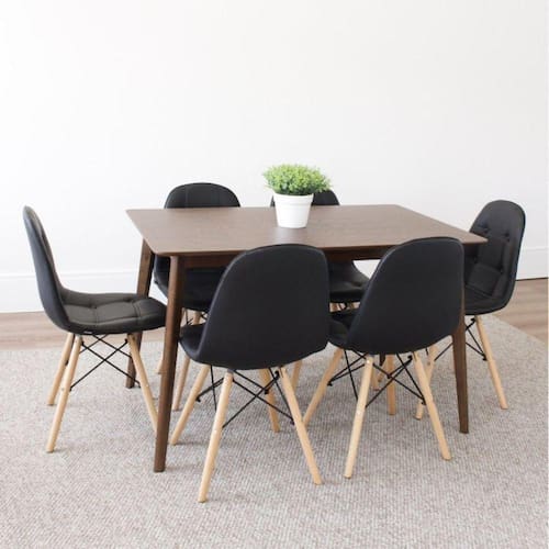 A Mesa Finlândia em madeira é ideal para quem busca elegância e praticidade, seu design rústico garante o detalhe que falta na decoração da sua casa. O conjunto com 6 cadeiras Eiffel Botonê completa o kit e garante o custo benefício para transformar o estilo divertido da sua casa com muita praticidade e toques de design. Conjunto composto por: uma Mesa com tampo em MDF de 19 mm, base em madeira seringueira + 6 cadeiras com assento revestido em PU, Base em madeira faia com armação em aço pintado. Possui Rodízio: Não Altura do Conjunto: 82 cm Ambiente: null Ambiente Principal: Sala de Jantar Cor: Preto/Nogueira Informação Complementar: 1x Mesa de Jantar Retangular Tampo MDF Finlândia NogueiraLargura: 120 cmAltura: 75 cmPeso: 19 kgProfundidade: 75 cmNecessita Montagem: Sim1x Conjunto 6 Cadeiras Botone Eiffel PretoLargura: 45 cmAltura: 82 cmPeso: 4,1 kgProfundidade: 50 cmNecessita Montagem: Sim Tamanho: