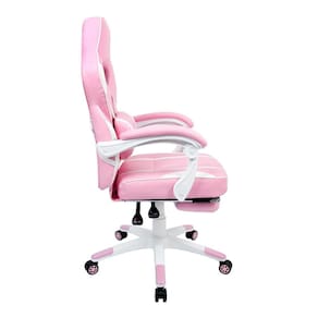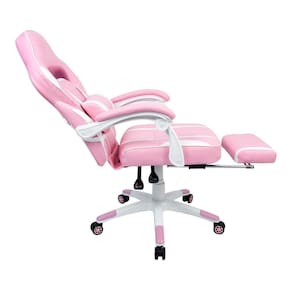 A Mesa Gamer PEL-008P Rosa tem estrutura metálica branca e tampo em MDF com revestimento rosa, que combina perfeitamente com a Cadeira Gamer PEL-3020 Rosa, que é revestida em couro PU rosa com detalhes em branco, encosto reclinável e apoio retrátil para as pernas localizado abaixo do assento que pode ser facilmente acionado; proporcionando muito mais conforto e garantindo uma ótima postura.