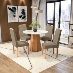 Sua Sala de Jantar de cara nova com a Linha da Kappesberg. A mesa, em MDP e pintura touch na cor canela, é redonda com acabamento exagonal, ela medindo 77cm de altura, 52cm de largura e profundidades, combinada com o tampo redondo, acomoda até quatro pessoas. Em MDF e na cor off white, o destaque fica para o vidro na mesma cor, e com medidas de 105cm X 105cm e espessura de 30cm, ele suporta até 90kg. Já as cadeiras, em madeira de eucalipto e montadas, com 97,5cm de altura, sendo 48cm a altura do assento, 42cm de largura e 58cm de profundidade, suportando até 130kg cada uma. Tanto o encosto quanto o assento são estofados e recobertos com tecido bouclé cinza, e os destaques ficam para o bordado e o puxador em madeira, que facilita o manuseio e deixa o seu espaço completo.