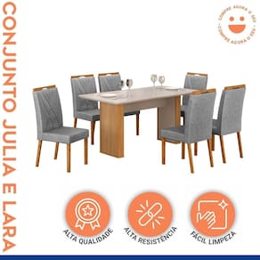 O conjunto Mesa Julia com 6 cadeiras combina elegância e conforto para a sua sala de jantar. A mesa oferece um design clássico e espaçoso, ideal para refeições em família. As cadeiras, com estofamento macio, proporcionam uma experiência de jantar agradável. Juntos, oferecem funcionalidade e estilo para sua casa. Medida da Mesa (A x L x P): 78cmx160cmx80cm Peso da Mesa: 52,6 kg Mesa suporta até: 40.0000 Acabamento da Cadeira/Banco: Pintura UV Acabamento da Mesa: Pintura UV Acompanha Manual de Instalação: Sim Almofada do assento: Fixa Almofada do encosto: Fixa Ambiente Principal: Sala de Jantar Cadeira/Banco estofada: Sim Cadeira/Banco suporta até: 120.0000 codigo_ean: 7909903573952 Complexidade da Montagem: Média: pode ser montado por mais de uma pessoa e/ou necessite de maior conhecimento para montagem Cor: Cinamomo/Off White/Prata Linho Cor do Produto: Cinamomo/Off White/Prata Linho Enchimento do Assento: Espuma D-23 Enchimento do Encosto: Espuma D-18 Escala de Brilho: Fosco Espessura do Tampo: 4 mm Estrutura do Assento: Madeira Itens Inclusos: 1 mesa Julia com 6 cadeiras Lara, manual de montagem e kit ferragens Manual de Montagem e Instalação: https://product-hub-prd.madeiramadeira.com.br/891883/documents/10562ae3-1a91-46e5-ba30-d3b43626f90b520mesajuliacomcadeiralara.pdf Material da Base da Mesa: MDF/MDP Material da Estrutura da Cadeira: Madeira Maciça Material do Tampo: Vidro Material Principal: MDF/MDP Medida da Cadeira/Banco (A x L x P): 97cmx45cmx60cm Medida do Tampo (L x C x E): 78cmx160cmx2,5cm Mesa Dobrável: Não Mesa Extensível: Não Necessita Montagem: Sim Origem do Produto: Nacional Peso da Cadeira/Banco: 10,5 kg Possui Apoio para Braços: Não Possui Apoio Para os Pés: Não Possui Prateleiras: Não Possui Suporte Giratório: Não Possui Vidro: Sim Quantidade de Cadeiras: 6 Quantidade de Lugares: 06 Recomendações de Uso, Manutenção e Limpeza: Para limpeza utilizar apenas um pano úmido. Revestimento da Cadeira/Banco: Linho Sistema de Montagem: Parafusos Tipo de Assento: Fixo Tipo de Encosto: Fixo Vidro Temperado: Sim