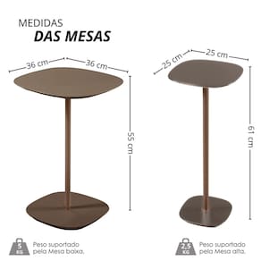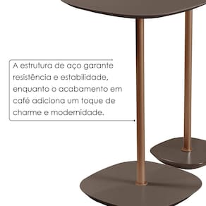 Um conjunto com duas mesas elegantes e funcionais, perfeitas para a sala de estar. Ambas possuem tampo em MDF, oferecendo resistência e um acabamento refinado, que une durabilidade e estilo. Suas bases em aço garantem estabilidade e um design contemporâneo, adicionando um toque moderno ao ambiente. Ideais para apoiar objetos decorativos ou utilitários, as mesas combinam praticidade e sofisticação de maneira harmoniosa. Ambiente Principal: Sala de Estar Complexidade da Montagem: Baixa: pode ser montado por uma pessoa sozinha Cor: Concreto/Café Cor do Produto: Concreto/Café Escala de Brilho: Fosco Itens Inclusos: 2 Mesas + Manual de Montagem + Kit ferragem. Manual de Montagem e Instalação: https://product-hub-prd.madeiramadeira.com.br/976624/documents/29ec464d-f550-43f8-acb1-bccfcfd775852666501493817387635980978.pdf Marca: Larflex Material do Tampo: MDF Material Principal: MDF Necessita Montagem: Sim Origem do Produto: Nacional Peso: 4,4 kg Possui Espelho: Não Possui Possui Gavetas: Não Possui Portas: Não Possui Prateleiras: Não Recomendações de Uso, Manutenção e Limpeza: Pano levemente umedecido e pano seco. Não utilizar produtos de limpeza Sistema de Montagem: Encaixe. Suporta Até (kg): 5 kg