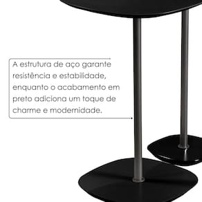 Um conjunto com duas mesas elegantes e funcionais, perfeitas para a sala de estar. Ambas possuem tampo em MDF, oferecendo resistência e um acabamento refinado, que une durabilidade e estilo. Suas bases em aço garantem estabilidade e um design contemporâneo, adicionando um toque moderno ao ambiente. Ideais para apoiar objetos decorativos ou utilitários, as mesas combinam praticidade e sofisticação de maneira harmoniosa. Ambiente Principal: Sala de Estar Complexidade da Montagem: Baixa: pode ser montado por uma pessoa sozinha Cor: Preto/Preto Cor do Produto: Preto/Preto Escala de Brilho: Fosco Itens Inclusos: 2 Mesas + Manual de Montagem + Kit ferragem. Manual de Montagem e Instalação: https://product-hub-prd.madeiramadeira.com.br/976668/documents/255887b0-d4bc-4bb9-9e6f-ffcf3c9975792666551493817387652122595.pdf Marca: Larflex Material do Tampo: MDF Material Principal: MDF Necessita Montagem: Sim Origem do Produto: Nacional Peso: 4,4 kg Possui Espelho: Não Possui Possui Gavetas: Não Possui Portas: Não Possui Prateleiras: Não Recomendações de Uso, Manutenção e Limpeza: Pano levemente umedecido e pano seco. Não utilizar produtos de limpeza Sistema de Montagem: Encaixe. Suporta Até (kg): 5 kg