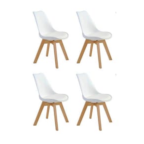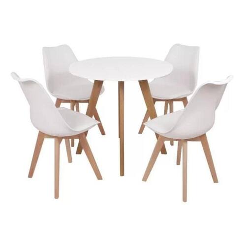 Mesa de Jantar Redonda 80cm Cor: Branca Diâmetro: 80cm Altura: 75cm Tampo em MDF OBS: Montagem não inclusa. Acompanha manual de instruções e chave para a montagem. 4 Cadeiras Leda – Charles Eames, Saarinen Wood com almofada Branca Assento em Polipropileno com almofada em PU Base em madeira com acabamento arredondado. Largura 49cm Profundidade 43cm Altura até o assento 45cm Altura até o encosto 82cm