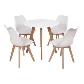 Conjunto Mesa Leda Branca 80 Cm + 4 Cadeiras Leda Brancas Mesa de Jantar Redonda 80cmCor: Branca Diâmetro: 80cmAltura: 75cmTampo em MDFOBS: Montagem não inclusa. Acompanha manual de instruções e chave para a montagem. 4 Cadeiras Leda Charles Eames, Saarinen Wood com almofada Branca Assento em Polipropileno com almofada em PUBase em madeira com acabamento arredondado. Largura 49cm Profundidade 43cm Altura até o assento 45cm Altura até o encosto 82cm