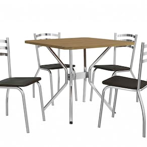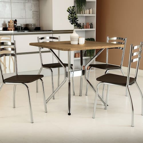 Para todos os espaços, aposte no conjunto CMC790 da Kappesberg. Em estrutura metálica cromada, a mesa conta com estrutura tubular circular, e com uma travessa central, os pés são dispostos em "K". Medindo 80,5cm de altura e 60cm de largura e profundidade, combinada com o tampo quadrado F090, em chapa MDP de 25mm e pintura touch na cor nogueira, ele possui pontas chanfradas e acomoda até quatro pessoas. Já as cadeiras, no modelo Portugal, também em estrutura metálica cromada, medindo 87,5cm de altura, sendo 46cm a altura do assento, suportam até 130kg, garantindo estabilidade e resistência. E para mais comodidade, o assento é estofado e recoberto com sintético na cor marrom. Já o encosto, garante um encaixe perfeito com as costas, proporcionando conforto ao produto.