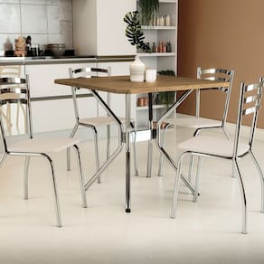 Para todos os espaços, aposte no conjunto CMC790 da Kappesberg. Em estrutura metálica cromada, a mesa conta com estrutura tubular circular, e com uma travessa central, os pés são dispostos em "K". Medindo 80,5cm de altura e 60cm de largura e profundidade, combinada com o tampo quadrado F090, em chapa MDP de 25mm e pintura touch na cor nogueira, ele possui pontas chanfradas e acomoda até quatro pessoas. Já as cadeiras, no modelo Portugal, também em estrutura metálica cromada, medindo 87,5cm de altura, sendo 46cm a altura do assento, suportam até 130kg, garantindo estabilidade e resistência. E para mais comodidade, o assento é estofado e recoberto com sintético na cor nude. Já o encosto, garante um encaixe perfeito com as costas, proporcionando conforto ao produto.