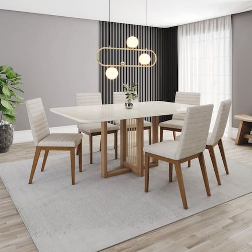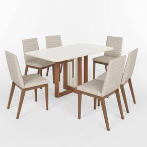 - Sapatas deslizantes. Medida da Mesa (A x L x P): 80 x 160 x 90cm Peso da Mesa: 54 kg Mesa suporta até: 40 kg Acabamento da Cadeira/Banco: Pintura Acabamento da Mesa: Pintura UV Ambiente Principal: Sala de Jantar Cadeira/Banco Estofada: Encosto e Assento Estofados Cadeira/Banco estofada: Encosto e Assento Estofados Cadeira/Banco Suporta Até: 120.0000 Cadeira/Banco suporta até: 120 kg codigo_ean: 7900288295279 Complexidade da Montagem: Média: pode ser montado por mais de uma pessoa e/ou necessite de maior conhecimento para montagem Cor: Marrom/Off White Cor do Produto: Marrom/Off White Cor Secundária: Marrom De Canto (Canto Alemão): Não Enchimento do Assento: Espuma D-23 Escala de Brilho: Fosco Espessura do Tampo: 25 mm Estrutura do Assento: MDF/MDP Formato do Tampo: Retangular Itens Inclusos: 1 Mesa, 6 Cadeiras, Kit Ferragens e Manual de Montagem Linha ou Coleção: Natalí/Elena Manual de Montagem e Instalação: https://product-hub-prd.madeiramadeira.com.br/399976259/documents/904351ec-5f5e-40ae-a465-97124f2ec2103334950326617648648613048.pdf Marca: Henn Material da Base da Mesa: MDP Material da Estrutura da Cadeira: MDF/MDP Material do Tampo: Vidro/MDF Material Principal: MDF/MDP Medida da Cadeira/Banco (A x L x P): 91 x 46 x 55cm Medida do Tampo (L x C x E): 160 x 90 x 2,5cm Mesa Extensível: Não Necessita Montagem: Sim Origem do Produto: Nacional Peso da Cadeira/Banco: 6 kg Possui Apoio Para os Pés: Não Quantidade de Cadeiras: 6 Quantidade de Lugares: 06 Recomendações de Uso, Manutenção e Limpeza: Para limpeza de seu móvel, use uma flanela limpa e seca. Não utilize produtos químicos que possam danificar o produto. Revestimento da Cadeira/Banco: Linho Sistema de Montagem: Parafusos e Cavilhas