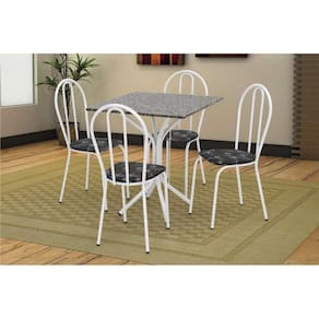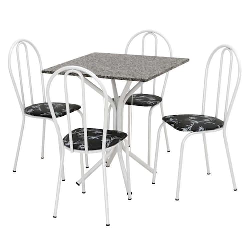 Pequeno, compacto e perfeito. Essas são algumas definições para o Conjunto de Mesas com 4 Cadeiras Thais, da Artefamol. Com tampo em granito, a qualidade e durabilidade está garantida. A estrutura da mesa e das cadeiras são feitas em aço-carbono, esse material consegue oferecer a resistência e durabilidade que só o aço pode proporcionar. As estruturas contam com o revestimento em pintura eletrostática a pó, isso quer dizer proteção contra a ação do tempo. Como se isso não bastasse, todas as soldas são realizadas com tecnologia da indústria automobilística, assegurando a alta qualidade do produto. Além disso, as 4 cadeiras possuem revestimento em courvin, deixando o conjunto com um toque de delicadeza ao ambiente.