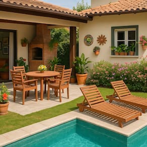 Conforto, charme e praticidade para transformar seu espaço! Este conjunto com mesa redonda, 4 cadeiras empilháveis e 2 espreguiçadeiras é ideal para quem gosta de aproveitar bons momentos ao ar livre. Produzido em madeira de reflorestamento, une consciência ambiental e beleza natural. O acabamento em stain fosco valoriza os veios da madeira. Fácil de montar, resistente e pensado para o seu bem-estar. A Mesa Suporta Até: 120 kg Acompanha Cadeiras: 04 Acompanha Espreguiçadeira: Sim Altura Ajustável: Não Altura das Cadeiras Até o Chão: 42 cm Ambiente Principal: Jardim e Varanda Apoio para Braços Estofado: Não Base Antiderrapante: Não Cada Cadeira Suporta Até: 120kg bem distribuidos Cadeira Estofada: Não codigo_ean: 7900288190680 Complexidade da Montagem: Baixa: pode ser montado por uma pessoa sozinha Cor: Madeira Cor do Produto: Madeira Dimensões de Cada Cadeira: 90X49,5X47,5 Espreguiçadeira Dobrável: Não Informações Complementares: Para manter a beleza e durabilidade do seu móvel, é importante realizar uma manutenção simples, especialmente se ele ficar exposto ao sol e à chuva com frequência. Use um pano limpo e seco para aplicar uma pequena quantidade de óleo mineral tipo Johnson’s Itens Inclusos: 1 Mesa, 4 Cadeiras, 2 Espreguiçadeiras, Manual de Montagem e Kit Ferragens Manual de Montagem e Instalação: https://product-hub-prd.madeiramadeira.com.br/589120734/documents/f4613802-f6e2-42e8-9234-7ada4cf3c9b53031657334817513084859482.pdf Marca: Cedro Rosa Material da Base da Mesa: Madeira Maciça Material do Tampo: Madeira Maciça Material Principal: Madeira Maciça Medida do Tampo: 120x120 Medidas da Base da Mesa: 79x79 Medidas da Espreguiçadeira: 192x70 Medidas da Mesa: 120x120x78 Mesa Dobrável: Não Necessita Montagem: Sim Origem do Produto: Nacional Peso da Mesa: 22 kg Peso de Cada Cadeira: 8 Possui Apoio para os Braços: Sim Possui Suporte para Copo: Não Possui travamento: Não Reclinação do Encosto: 04 Posições Recomendações de uso: Para manter a beleza e durabilidade do seu móvel, é importante realizar uma manutenção simples, especialmente se ele ficar exposto ao sol e à chuva com frequência. Use um pano limpo e seco para aplicar uma pequena quantidade de óleo mineral tipo Johnson’s Resistência à Água: Sim Tampa com orifício removível: Não Tampo Fixo: Sim Tipo de Madeira Maciça da Base da Mesa: Eucalipto Tipo de Madeira Maciça do Tampo: Eucalipto