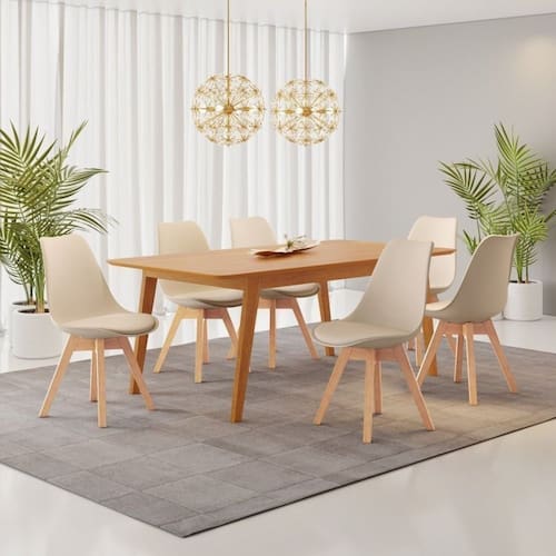 As mesas são indispensáveis para o bom funcionamento de uma casa e por isso a Mesa Elegance é ideal para cozinhas ou salas de jantar. Possui amplo espaço para que você possa dispor pratos, copos, talheres e objetos diversos. Com pés em madeira maciça o móvel é de fácil combinação sendo perfeito para a sua rotina ou reuniões de convidados.Procurando uma Cadeira que une design, elegância e conforto? Conheça nossa Cadeira Saarinen Wood com Base de Madeira Natural. Eero Saarinen foi um designer finlandês de muito sucesso na década de 50 e produziu móveis icônicos que são inspiração para o desenvolvimento de móveis até hoje. A clássica cadeira com assento estofado que leva seu nome vem agora com uma versão mais moderna. A Cadeira Saarinen Wood com Base de Madeira Natural é ideal para ambientes como; sala de jantar, sala de estar, cozinha, áreas internas, mesas de leitura e muito mais. O conjunto combina com diversos ambientes e estilos. Medida da Mesa (A x L x P): 78cm x 120cm x 80cm Peso da Mesa: 30 kg Mesa suporta até: 35.0000 Altura do Conjunto: 82 cm Ambiente: null Ambiente Principal: Sala de Jantar Apoio para Braços Estofado: Não Cadeira/Banco suporta até: 110.0000 codigo_ean: 7909903406120 Complexidade da Montagem: Baixa: pode ser montado por uma pessoa sozinha Cor: Nude/Cinamomo Cor do Produto: Nude/Cinamomo Cor do Tampo: Natural De Canto (Canto Alemão): Não Espessura do Tampo: 25 mm Formato do Tampo: Retangular Informação Complementar: 1x Cadeira para Sala de Jantar Saarinen PP Nude Largura: 49 cm Altura: 82 cm Peso: 4,6 kg Profundidade: 56 cm Necessita Montagem: Sim