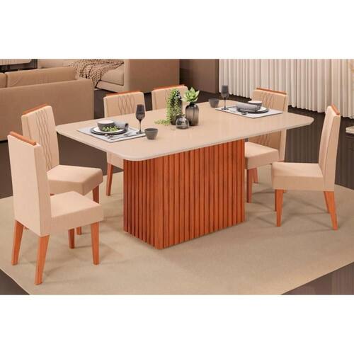 Sala de Jantar Completa Canes Tampo Madeirado c/ Vidro Curvo 170x90cm e 6 Cadeiras Zoe Freijo/Off White - Suede Kraft - DJ Móveis