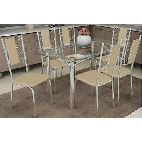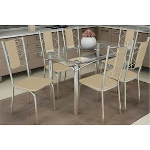 Sala de Jantar Completa Elba c/ Tampo de Vidro 120cm e 6 Cadeiras Lisboa Cromada - Courano Bege - Kappesberg Abaixo segue os produtos do KIT: Sala de Jantar Completa Elba c/ Tampo de Vidro 120cm e 6 Cadeiras Lisboa Cromada - Courano Bege - Kappesberg