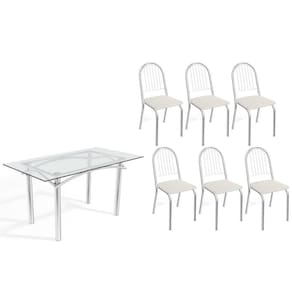 Sala de Jantar Completa Elba c/ Tampo de Vidro 150cm e 6 Cadeiras Noruega Cromada - Courano Branco - Kappesberg
