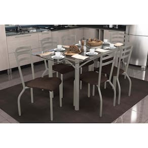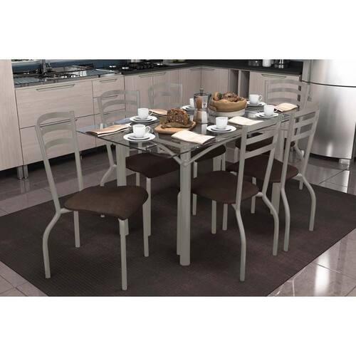Sala de Jantar Completa Elba c/ Tampo de Vidro 150cm e 6 Cadeiras Portugal Niquel - Courano Marrom - Kappesberg