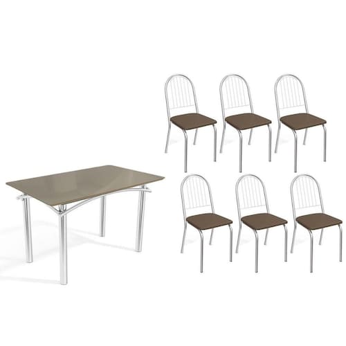 Abaixo segue os produtos do KIT: Sala de Jantar Completa Elba Tampo Madeirado c/ Vidro 120cm e 6 Cadeiras Noruega Cromada/Freijo Bronze - Courano Marrom - Kappesberg
