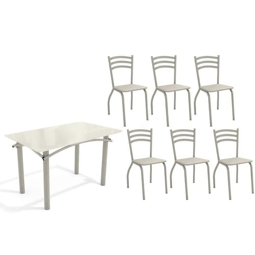 Abaixo segue os produtos do KIT: Sala de Jantar Completa Elba Tampo Madeirado c/ Vidro 120cm e 6 Cadeiras Portugal Niquel/Off White - Courano Bege - Kappesberg