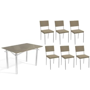 Sala de Jantar Completa Elba Tampo Madeirado c/ Vidro 120cm e 6 Cadeiras Zaria Cromada/Freijo Bronze - Boucle Bege - Kappesberg