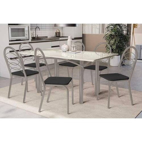 Sala de Jantar Completa Elba Tampo Madeirado c/ Vidro 160cm e 6 Cadeiras Holanda Niquel/Off White - Courano Preto - Kappesberg Abaixo segue os produtos do KIT: Sala de Jantar Completa Elba Tampo Madeirado c/ Vidro 160cm e 6 Cadeiras Holanda Niquel/Off White - Courano Preto - Kappesberg