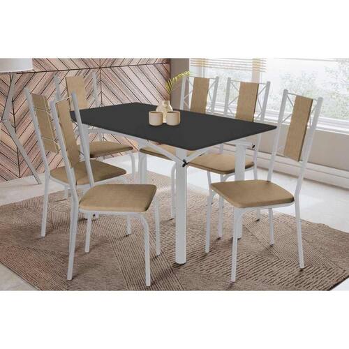 Sala de Jantar Completa Elba Tampo Madeirado c/ Vidro 160cm e 6 Cadeiras Lisboa Cromada/Preto - Courano Capuccino - Kappesberg