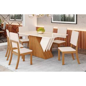 Sala de Jantar Completa Épic SC24 Tampo Madeirado c/ Vidro Canto Curvo 160x90cm e 6 Cadeiras Milla Nature/Suede Light Linho - Henn