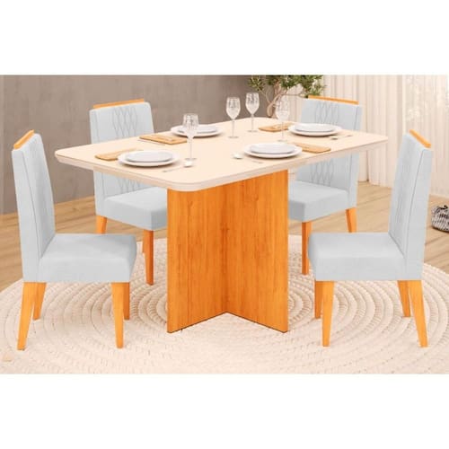 Conjunto: Mesa Sala Jantar Hera Tampo Madeirado c/ Vidro Reto 120x90cm e 4 Cadeiras Lia Cedro/Off White - Linho Neve - DJ Móveis - Blush