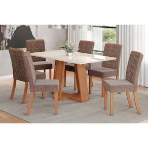 Sala de Jantar Completa Lins c/ Tampo Madeirado c/ Vidro 160x90cm e 6 Cadeiras Esther Nature/Linho Cacao - Henn