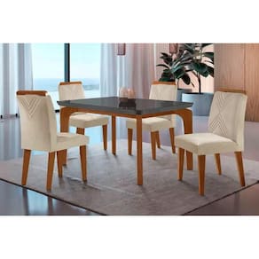 Abaixo segue os produtos do KIT: Sala de Jantar Completa Londrina c/ Tampo Madeirado c/ Vidro Canto Curvo 120x80cm e 4 cadeiras Amsterdã Imbuia/Grafite - Suede Creme - Rufato