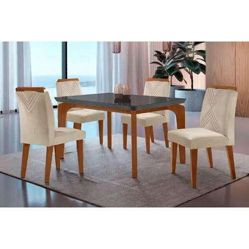 Sala de Jantar Completa Londrina c/ Tampo Madeirado c/ Vidro Canto Curvo 120x80cm e 4 cadeiras Amsterdã Imbuia/Grafite - Suede Creme - Rufato