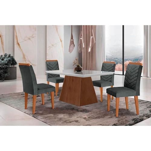 Abaixo segue os produtos do KIT: Sala de Jantar Completa Luna c/ Tampo Madeirado c/ Vidro Canto Curvo 120x80cm e 4 cadeiras Londrina Imbuia/Off White - Suede Grafite - Rufato