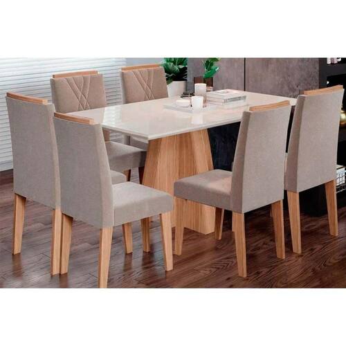 Sala de Jantar Completa Maitê Tampo Madeirado c/ Vidro Canto Curvo 160X80cm e 6 Cadeiras Nicole Nature/Suede Nude Bege - Cimol Abaixo segue os produtos do KIT: Sala de Jantar Completa Maitê Tampo Madeirado c/ Vidro Canto Curvo 160X80cm e 6 Cadeiras Nicole Nature/Suede Nude Bege - Cimol