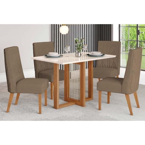 Sala de Jantar Completa Natalí c/ Tampo Madeirado c/ Vidro Reto 120x80cm e 4 Cadeiras Eloa Nature/Suede Light Marrom Amêndoa - Henn