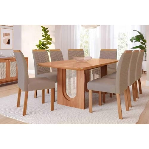 Sala de Jantar Completa Valentina c/ Tampo Madeirado 210x100cm e 8 Cadeiras Clarice Cinamomo - Carvalho/Suede Joli Capuccino - Cimol Abaixo segue os produtos do KIT: Sala de Jantar Completa Valentina c/ Tampo Madeirado 210x100cm e 8 Cadeiras Clarice Cinamomo - Carvalho/Suede Joli Capuccino - Cimol
