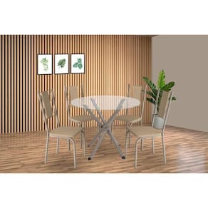 Sala de Jantar Completa Volga c/ Tampo de Vidro 95cm e 4 Cadeiras Lisboa Niquel - Courano Bege - Kappesberg Abaixo segue os produtos do KIT: Sala de Jantar Completa Volga c/ Tampo de Vidro 95cm e 4 Cadeiras Lisboa Niquel - Courano Bege - Kappesberg Tampo Mesa Sala de Jantar Vidro TAV9561 Vidro Redondo 95cm Incolor - Kappesberg