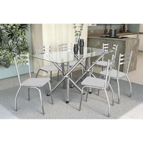 Sala de Jantar Completa Volga c/ Tampo Vidro 150cm + 6 Cadeiras Portugal Cromado/Courano Branco - Kappesberg