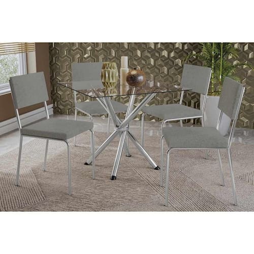 Conjunto: Mesa Sala Jantar Volga C/ Tampo De Vidro 90cm E 4 Cadeiras Zaria Cromada - Boucle Cinza - Kappesberg