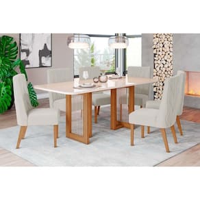Sala de Jantar Completa Yara c/ Tampo Madeirado c/ Vidro Curvo 160x90cm e 6 Cadeiras Eloa Nature/Suede Light Linho - Henn Abaixo segue os produtos do KIT: Sala de Jantar Completa Yara c/ Tampo Madeirado c/ Vidro Curvo 160x90cm e 6 Cadeiras Eloa Nature/Suede Light Linho - Henn